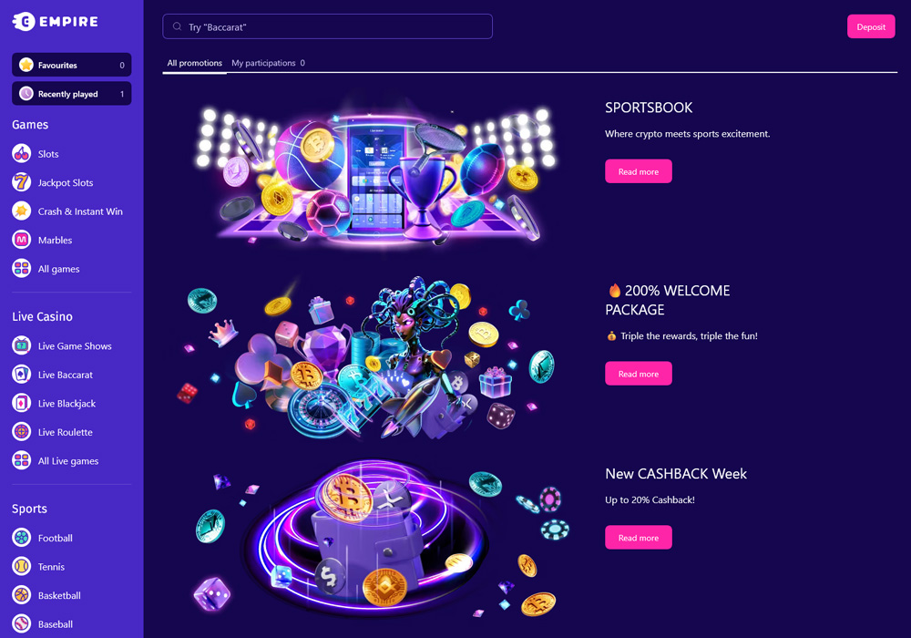 Empire.io has firmly established itself as a leading player in the cryptocurrency casino market since its launch in 2022. Through a perfect blend of extensive gaming options, robust security measures, and user-friendly features, the platform delivers a comprehensive online gambling experience that sets new standards in the industry.