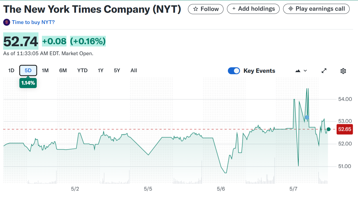 - NYT stock closed at $52.66, up 0.75% before earnings release on May 7, 2025