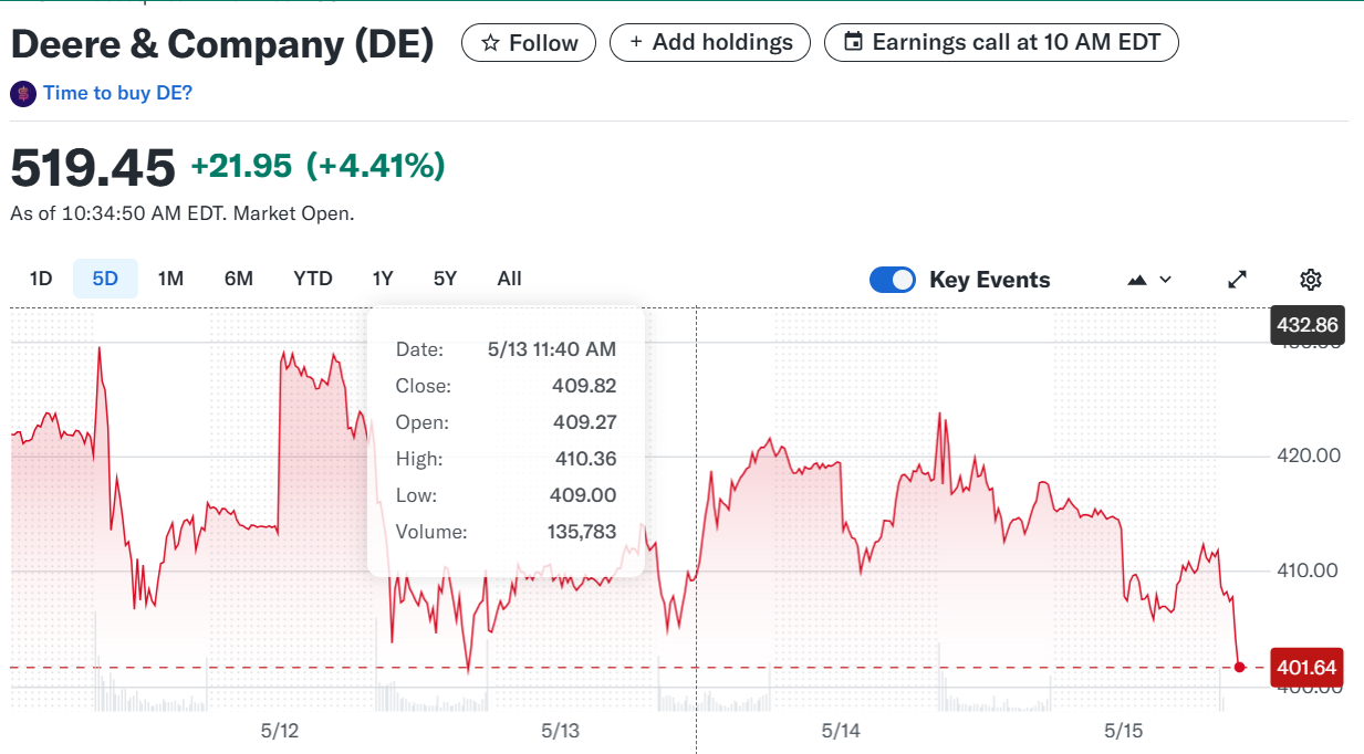 Deere stock saw an early gain of over 4% to $518.48 but quickly dropped, reflecting sharp market reactions. The movement followed the release of Deere’s second-quarter 2025 earnings, which showed a notable decline in profit. While performance exceeded expectations in some operational areas, overall financials highlighted a tough quarter for the agricultural equipment giant.