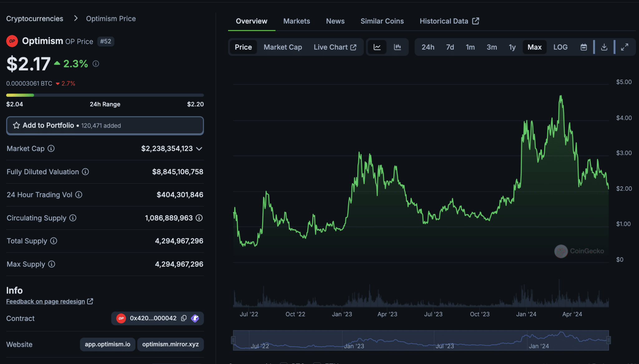 As of this writing, $OP has a market cap of $2.2 billion and a circulating supply of nearly 1.1 billion $OP. The token’s max supply is listed as 4,294,967,296 $OP.