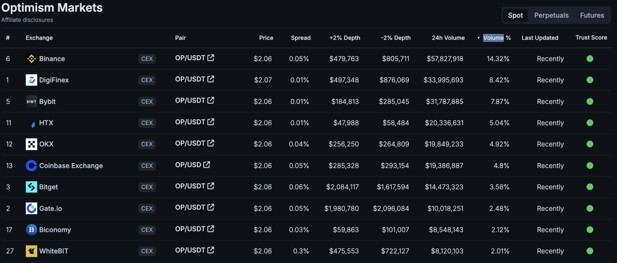 $OP sees its highest trading volume on Binance, followed by DigiFinex, Bybit, HTX (formerly Huobi), and OKX.