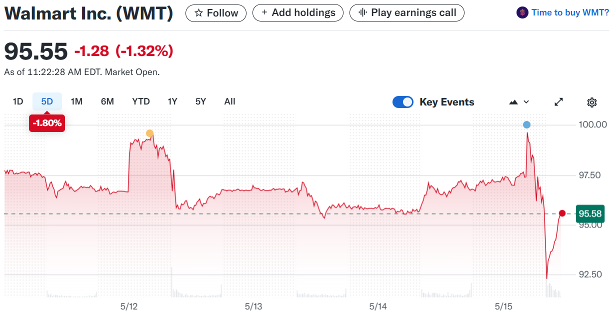 Walmart Inc. (NYSE: WMT) shares dropped over 4% at some point early Thursday, to trade at $91, after the company posted solid first-quarter sales on May 15, 2025, but warned that prices are rising due to trade policy shifts.