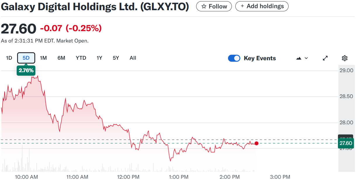 Galaxy Digital is trading at $27.60, down 0.25% as of trading hours, showing a modest pullback during the trading day. Over the past 5 days, the stock is up 2.76%, indicating short-term positive momentum.