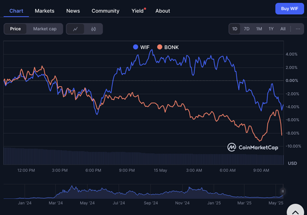 BONK and WIF benefit from a broader meme coin revival linked to reduced global tensions, such as easing US-China trade disputes, which have lowered investor risk aversion. This environment has created fresh capital flows into altcoins, especially those tied to popular ecosystems like Solana.
