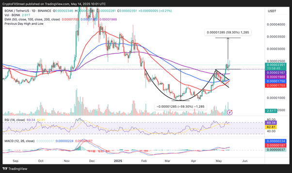 BONK coin posted a 73% gain in April, continuing with over 20% growth into May. Despite entering overbought territory as indicated by the Relative Strength Index (RSI), BONK shows resilience, with traders ready to buy dips near support levels around $0.000017.