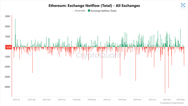 But perhaps the biggest signal is what’s not happening. Ethereum exchange reserves dropped 1.1% in a 24 hour period, and net flows are negative. That means ETH is flowing out of exchanges and into self-custody, typically a sign that investors are planning to hold, not sell.