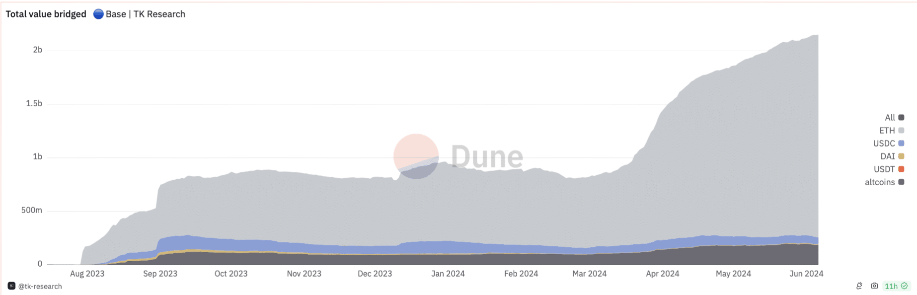Around the same time, Base broke the $1 billion in total value bridged and currently has about $2.1 trillion of total value bridged, with ETH taking the lion’s share.