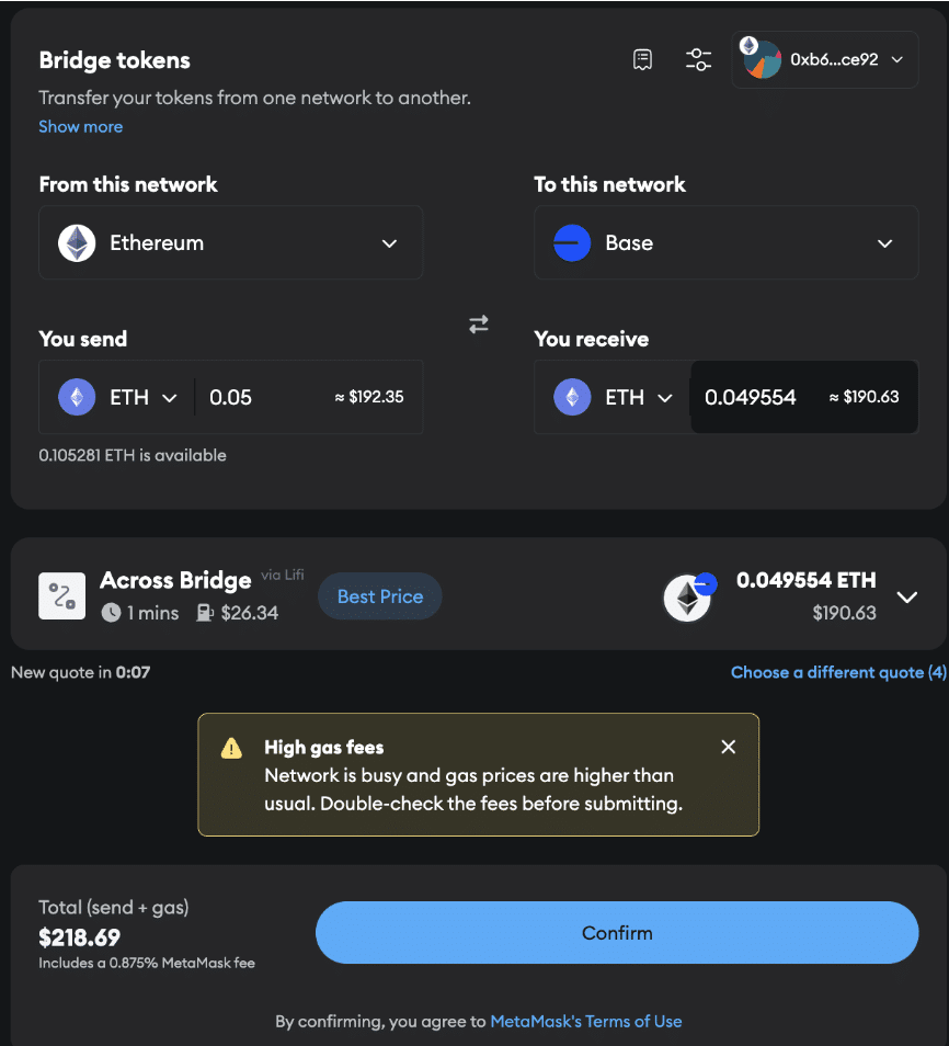 ????Note: While the gas fees are significantly lower on Base, you still have to pay ETH’s Layer-1 fees to bridge funds.