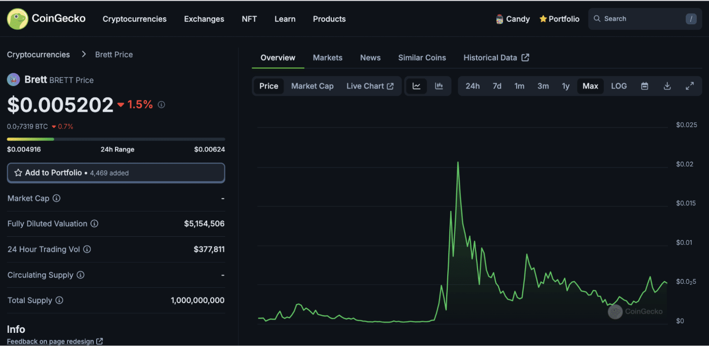 As of writing, the $BRETT memecoin is having its moment in the sun.