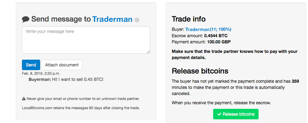 Now that all parties have agreed on the transaction and ironed out the specifics in the inbox section of LocalBitcoins, the Bitcoins will be moved from your wallet to the trade escrow. At this point, the buyer will get your payment details (how do you want to get paid for your BTC) and release the USD equivalent in cash over to you in the agreed-upon manner. When you have received the payment, you’d confirm to Localbitcoins.com that the payment has been made and the BTC will be released to the buyer from trade escrow.