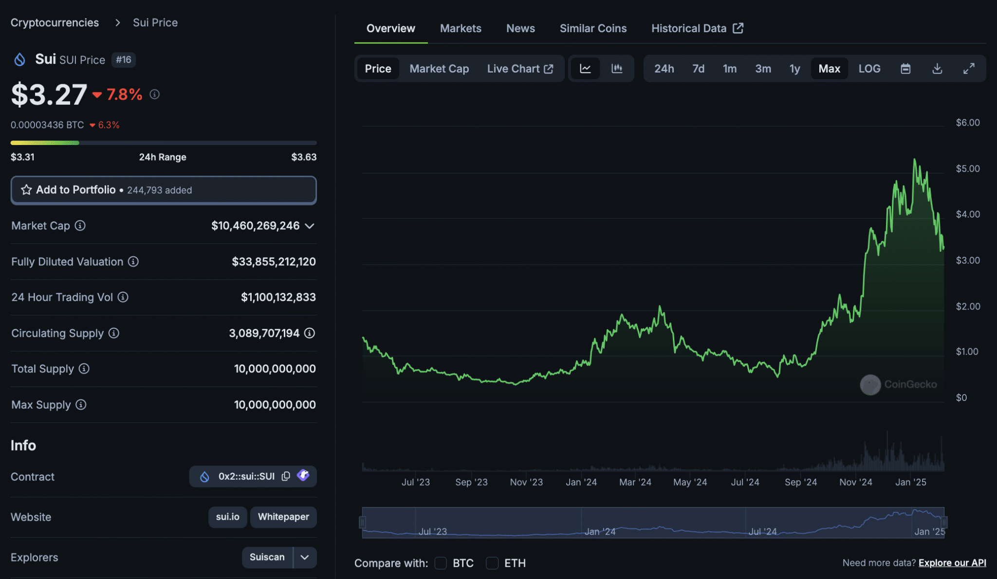 Sui’s native token, $SUI, underpins the network. With a fixed supply of 10 billion tokens, distribution is structured to prevent inflation spikes while sustaining long-term liquidity. As of early 2025, around 3.1 billion tokens were in circulation, with more unlocking gradually through 2030.